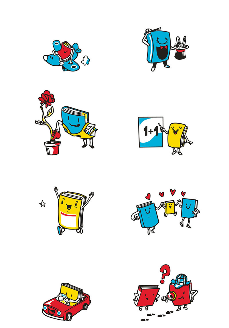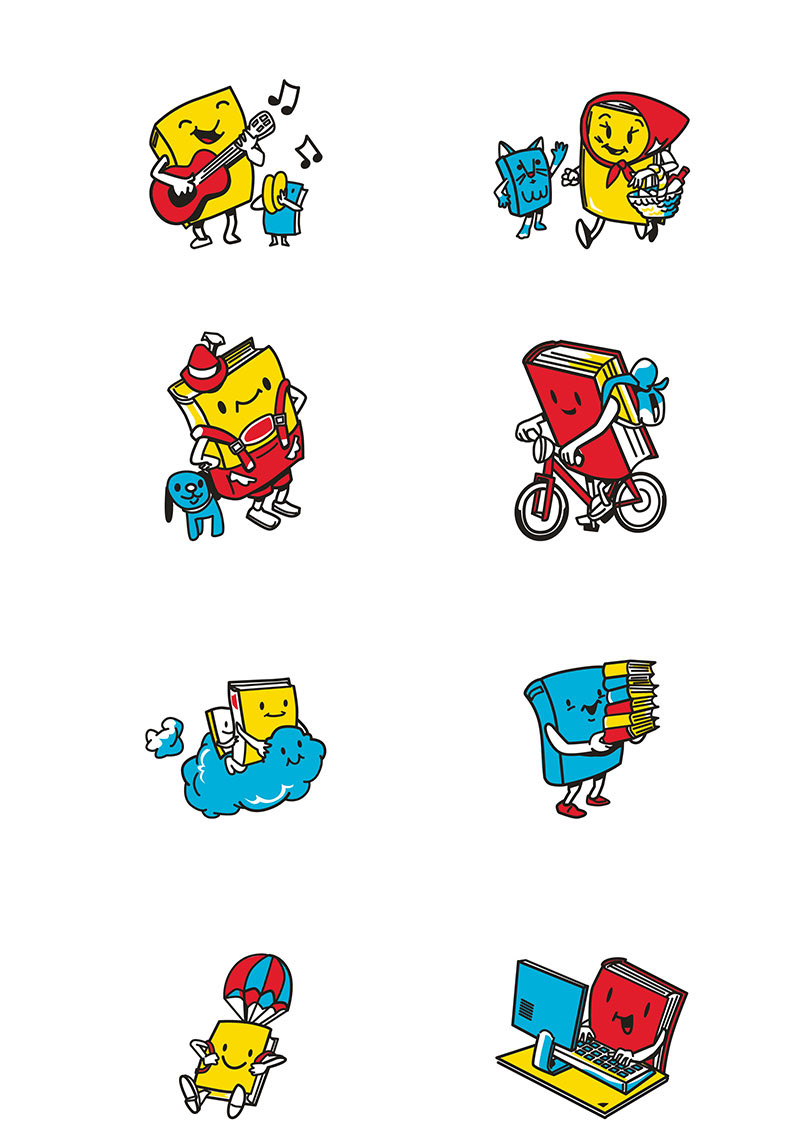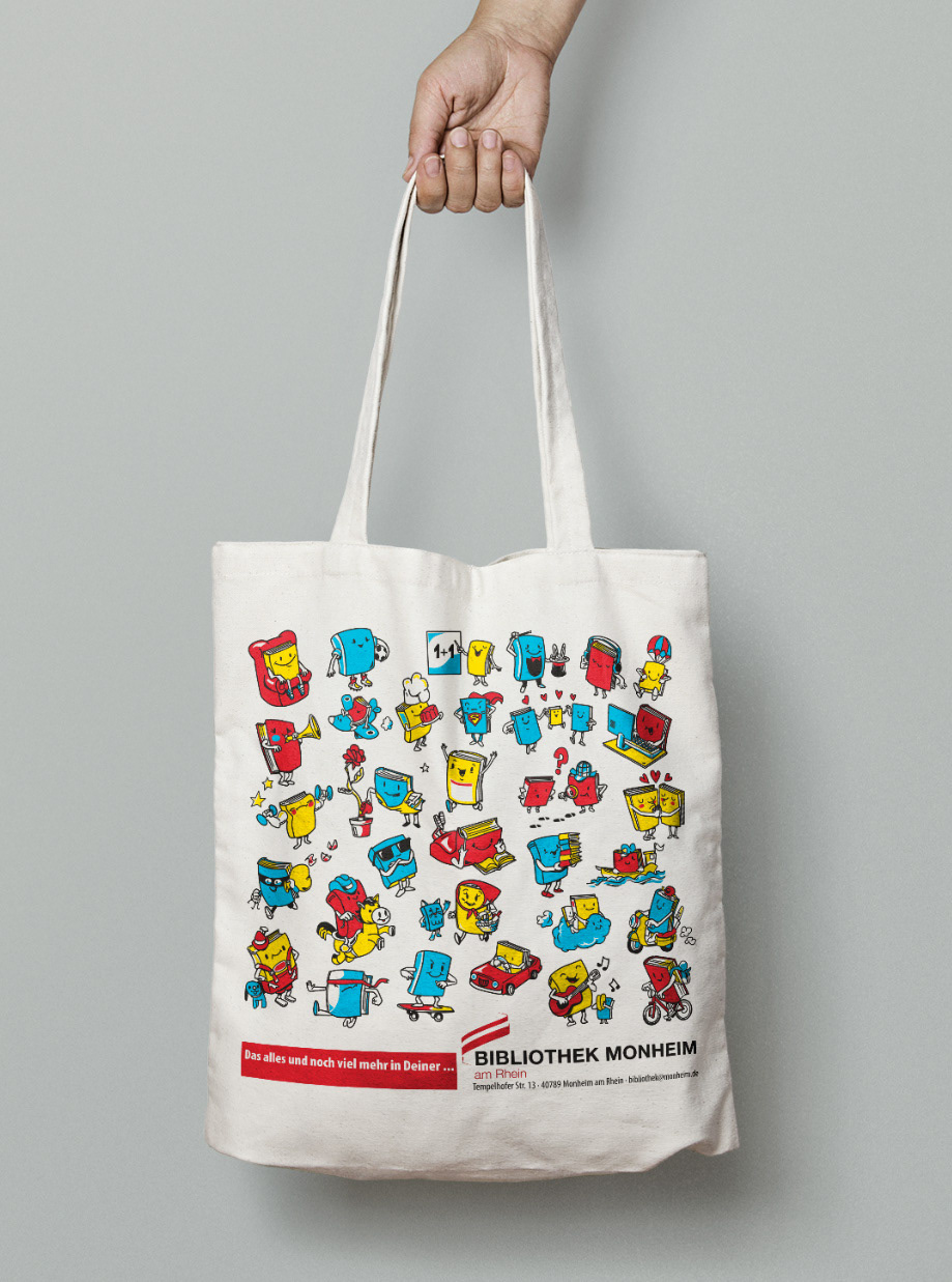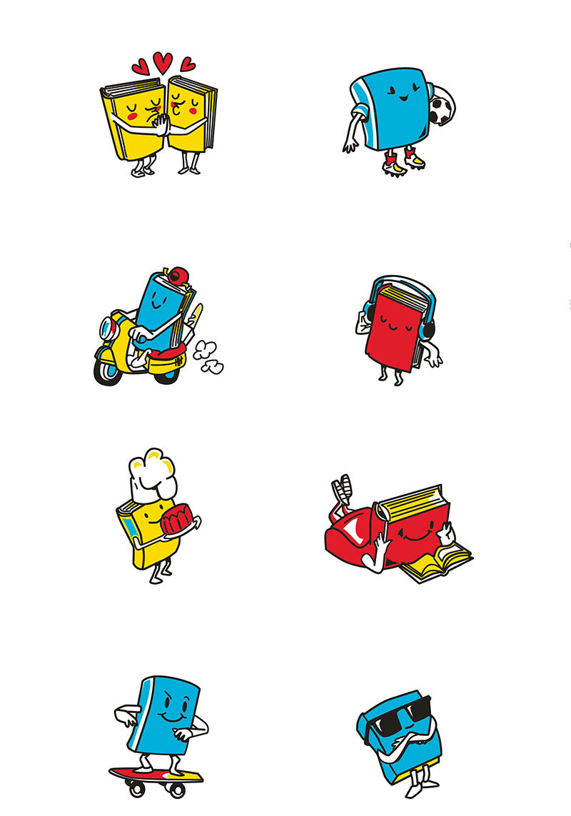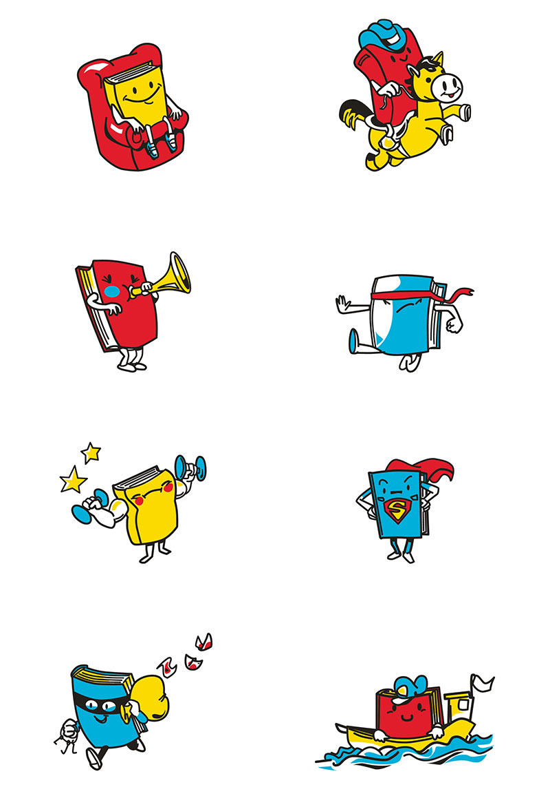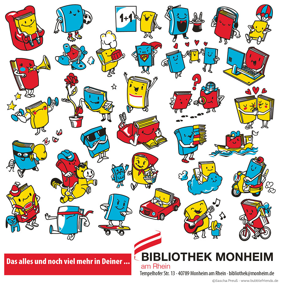 Charakterdesign für eine Bibliothek. Es sollte das vielseitige Angebot an Büchern von Krimis über Liebesromanen bis hin zum digitalen Angebot der Bücherei gezeigt werden.