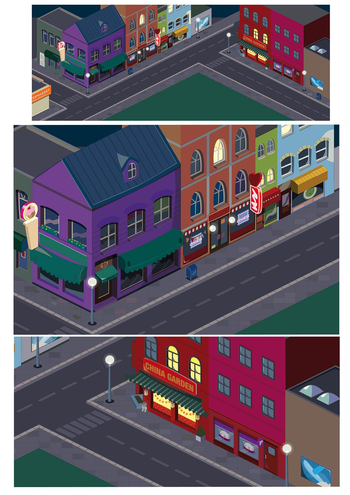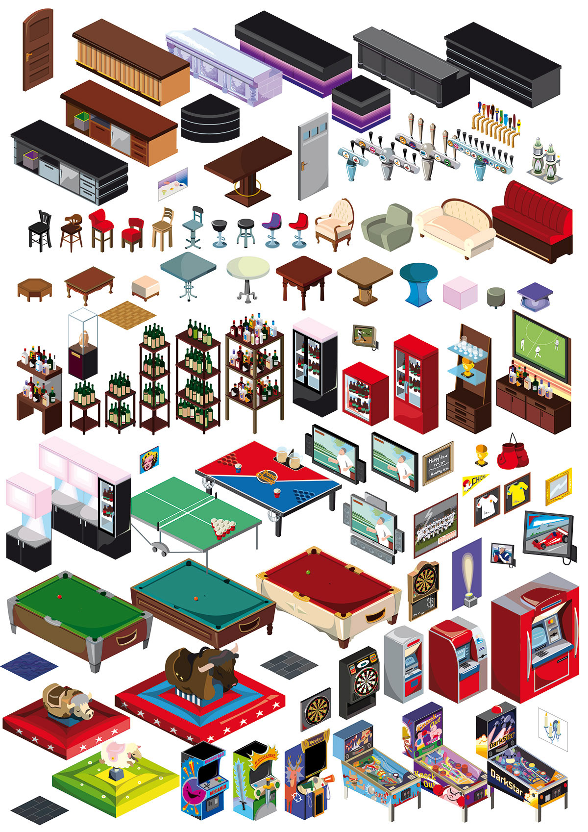 Illustration einer Strassenszene als Hintergrund für ein Online Game. Illustration von Einrichtungsgegenständen und Upgrades für eine Bar.