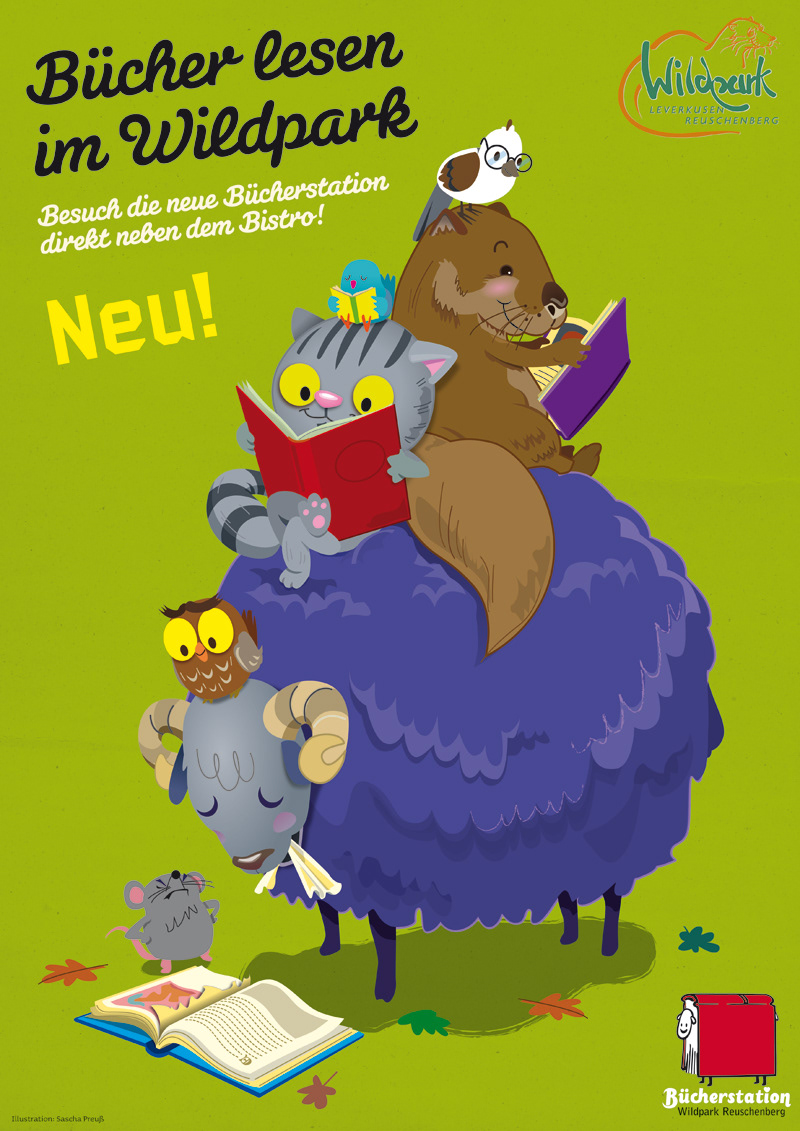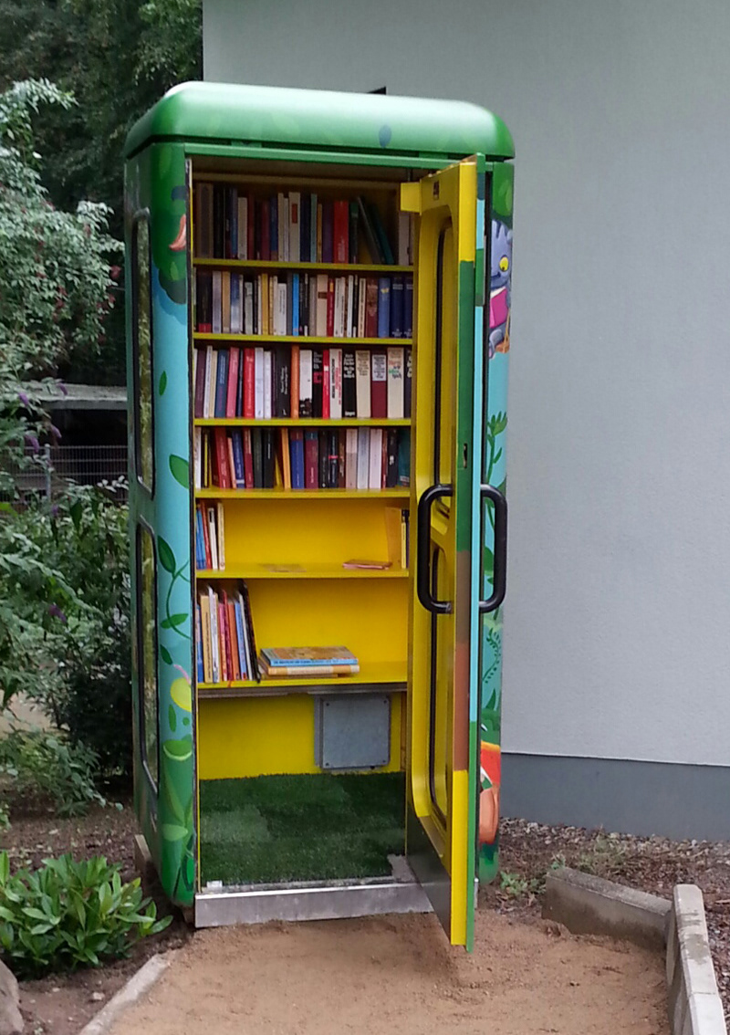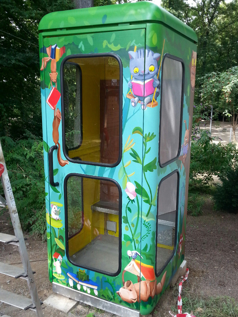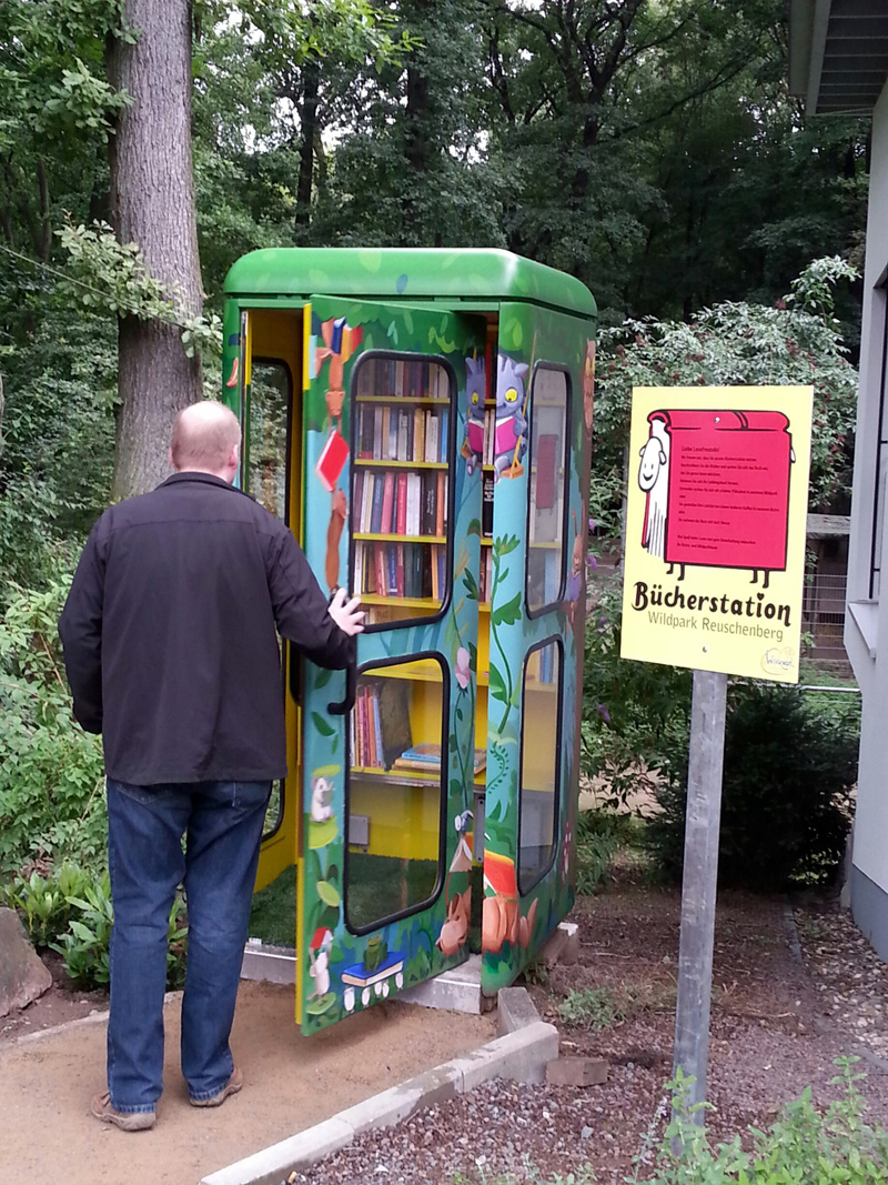 Umgestaltung einer alten Telefonzelle in einem Wildpark. Die Telefonzelle wurde zur Bücherstation umgebaut und dient jetzt als Minibücherei.